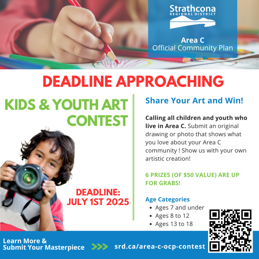 DEADLINE APPROACHING SOON ! AREA C – Kids & Youth Art Contest 6 Prizes (of $50 value) are up for grabs Calling all children and youth who live in Area C ! Submit an original drawing or photo that shows what you love about your Area C community ! Deadline: July 1st, 2025 Learn more…