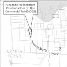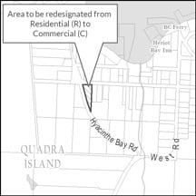 Purpose of proposed Bylaws: The bylaws, if adopted, would re-designate and rezone a 0.46-hectare parcel of land at 1313 Cramer Road, Heriot Bay BC, from Residential / Residential One (R-1) to Commercial / Commercial Two E (C-2E) to facilitate the use of the property at 1313 Cramer Road, Heriot Bay BC for Tourist Commercial storage purposes, relating to multi-day kayaking tours arranged on the BC coast.