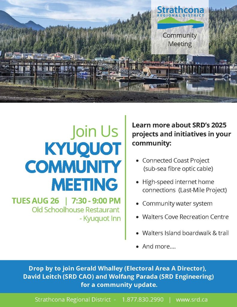 KYUQUOT COMMUNITY MEETING TUES AUG 26 | 7:30 – 9:00 PM Old Schoolhouse Restaurant Kyuquot Inn Please join us to learn more about SRD projects and initiatives: • Connected Coast Project (sub-sea fibre optic cable) • High-speed internet home connections (Last-Mile Project) • Community water system • Walters Cove Recreation Centre • Walters Island boardwalk…