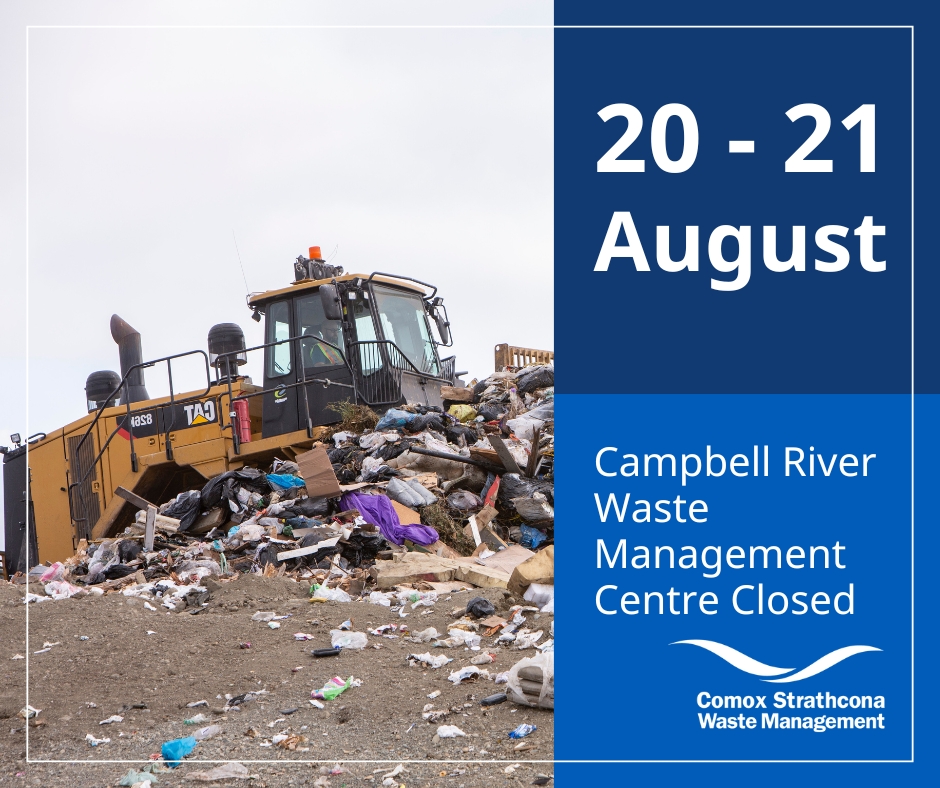 The Campbell River Waste Management Centre will be closed on Wednesday, August 20 and Thursday, August 21, to facilitate the cleanup of improperly disposed asbestos containing material. The health and safety of our staff and customers is our top priority.